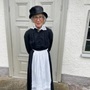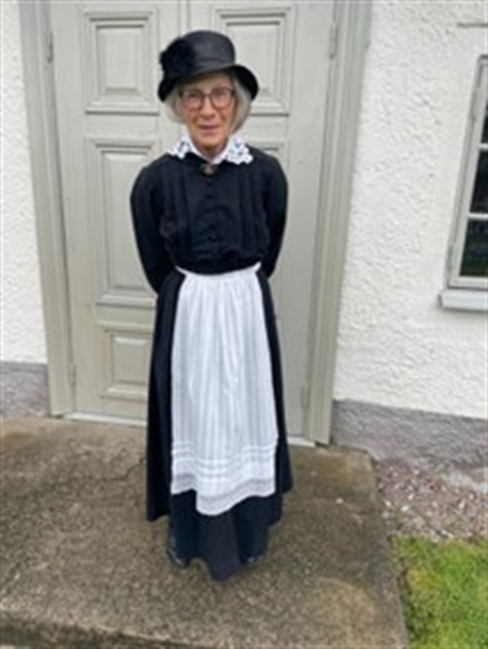 När gårdsklockan ringde gick vi mot huvudbyggnaden och ut kom en mycket elegant kvinna, klädd i kläder från svunnen tid och hälsade oss välkomna.
